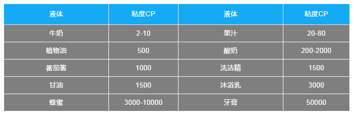 粘度是流体的物理特性,流体都有一定粘度,水的粘度是1CP,以下是其它常见液体的粘度表格供参考: