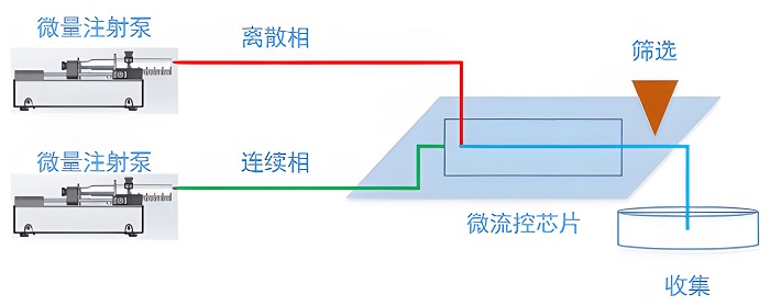 在生物实验室中,液滴生成系统主要包括微量注射泵、微流控芯片和高通量筛选系统三个部分。